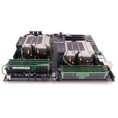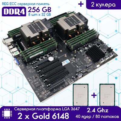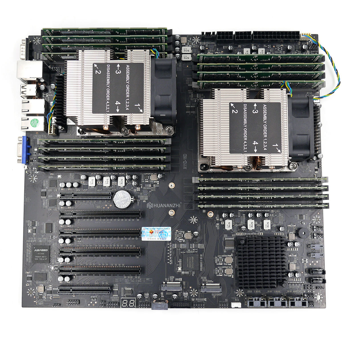Двухпроцессорная серверная платформа (без шасси) на базе платы HUANANZHI X11D-16D DUAL LGA 3647 форм-фактора Е-АТХ с двумя процессорами, серверной оперативной памятью и кулерами.