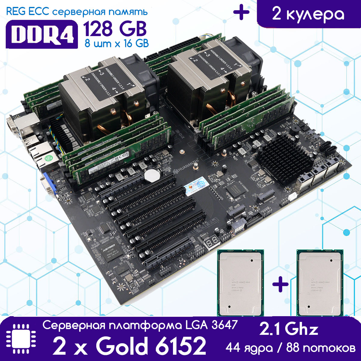 Двухпроцессорная серверная платформа (без шасси) на базе платы HUANANZHI X11D-16D DUAL LGA 3647 форм-фактора Е-АТХ с двумя процессорами, серверной оперативной памятью и кулерами.
