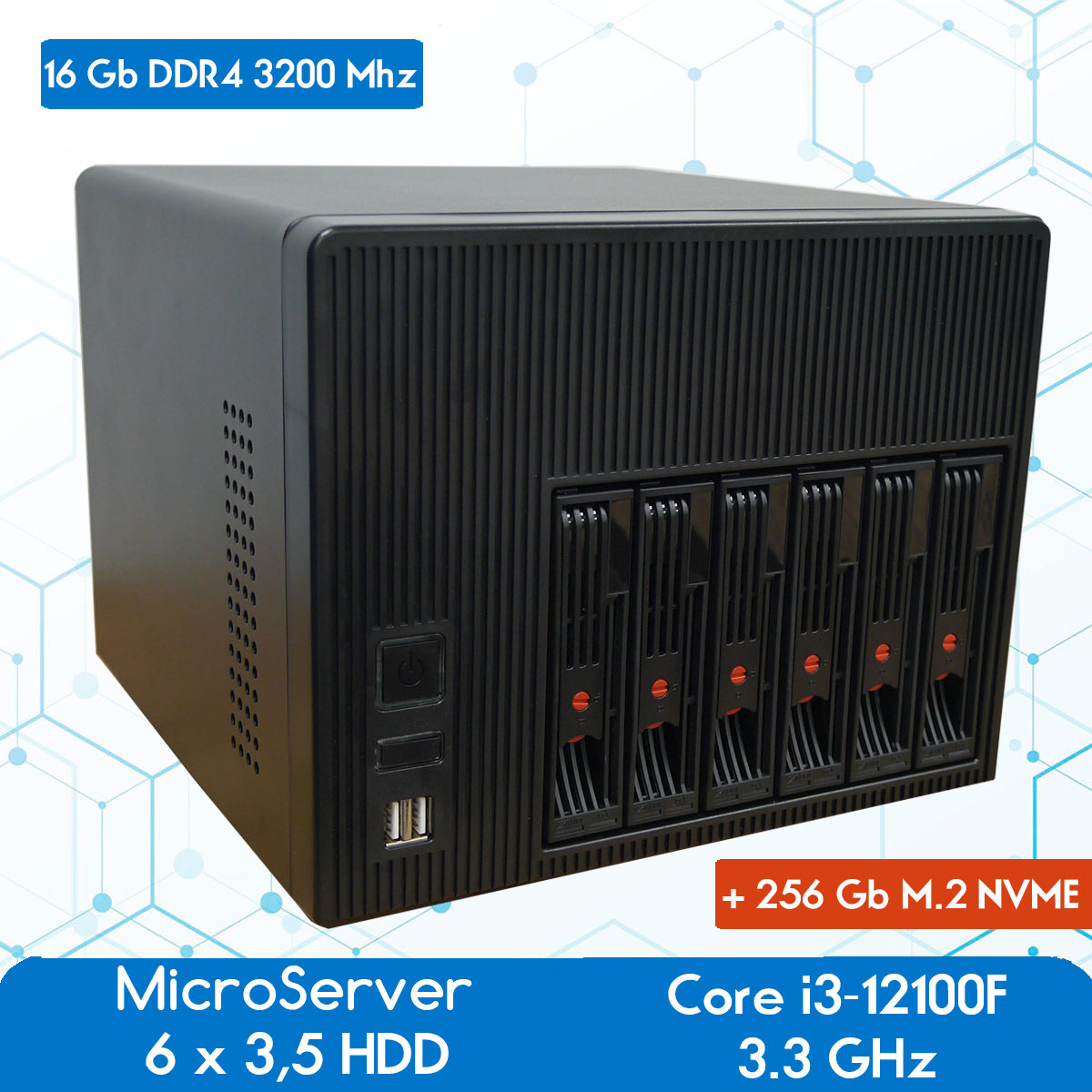 Эксклюзивный микросервер / сетевое хранилище NAS на 6 дисков 3.5"/2,5" формата, 4-х ядерным процессором Intel Core i3-12100F (с поддержкой виртуализации), 16 Гб памяти DDR4, двумя сетевыми картами и M.2 SSD NVME 256 Gb