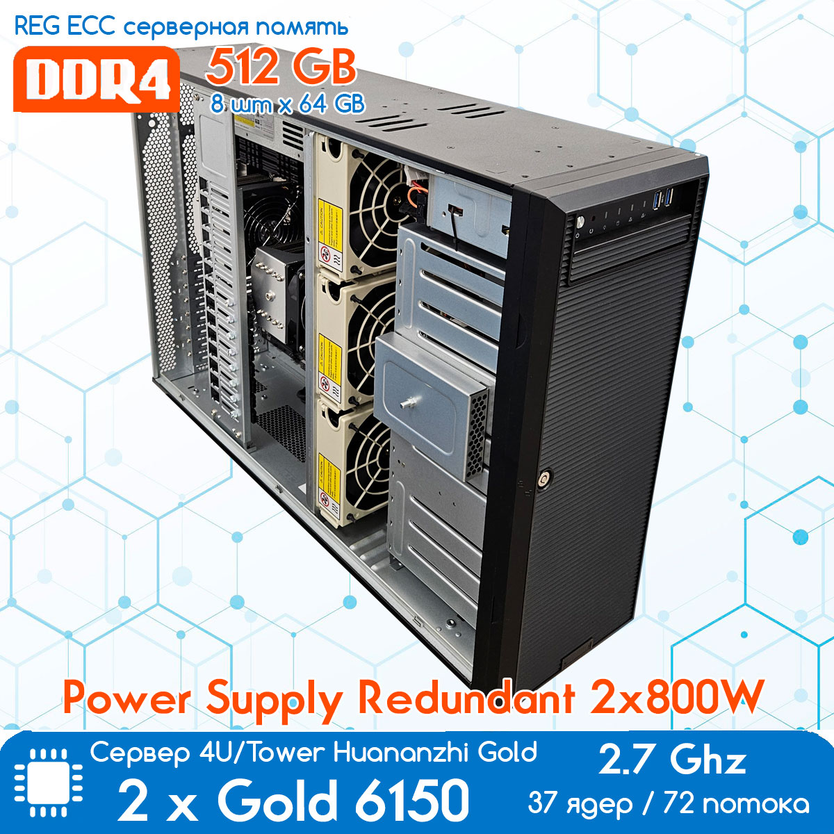 Высокопроизводительный сервер Tower/4U (возможность установки в стойку) с удаленным управлением и мониторингом на базе двухпроцессорной платы HUANANZHI X11D-16D, двух 18-ядерных процессоров Intel Xeon Gold 6150 LGA3647 2,7 ГГц, 512 Гб регистровой памяти DDR4 и блоком питания с резервированием 2x800W, без дисков