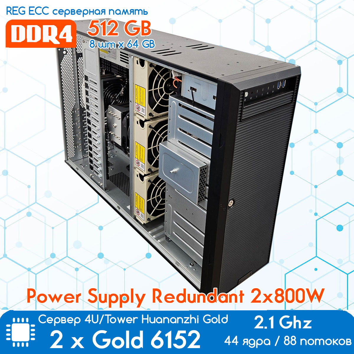 Высокопроизводительный сервер Tower/4U (возможность установки в стойку) с удаленным управлением и мониторингом на базе двухпроцессорной платы HUANANZHI X11D-16D, двух 22-ядерных процессоров Intel Xeon Gold 6152 LGA 3647 2,1 ГГц, 512 Гб регистровой памяти DDR4 и блоком питания с резервированием 2x800W, без дисков
