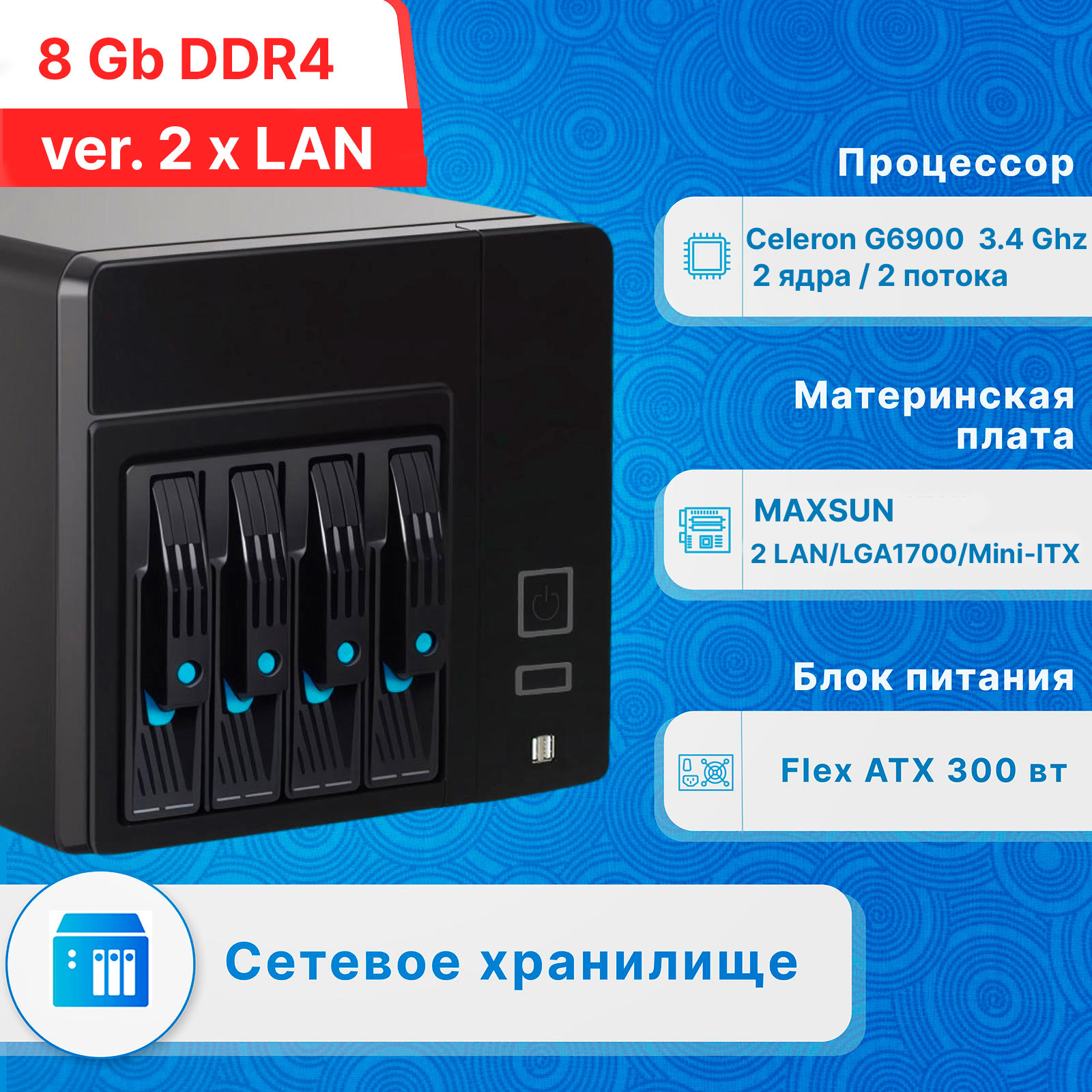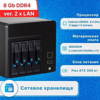 Сетевое хранилище NAS на 4 отсека под 3.5"/2.5" диски, двухъядерным процессором Intel Celeron G6900 и 8 Гб оперативной памяти DDR4